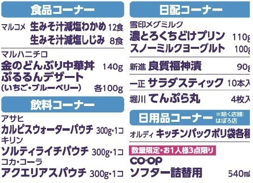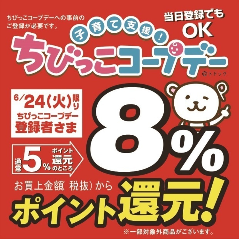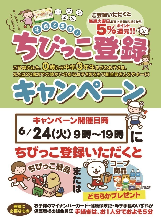6月24日(火)にご登録いただくと、ちびっこ景品又はコープ商品どちらかのプレゼントがあります。