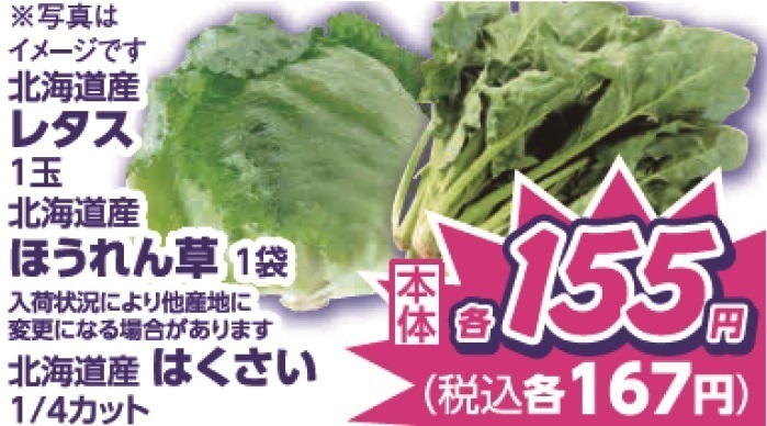 レタス、ほうれん草、はくさい、葉物野菜もお買得ですよ。