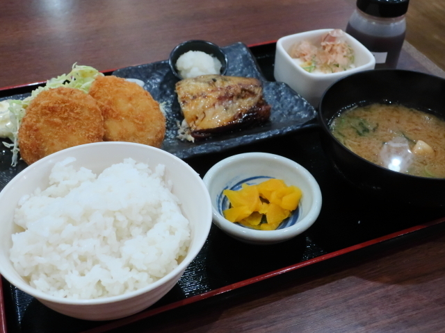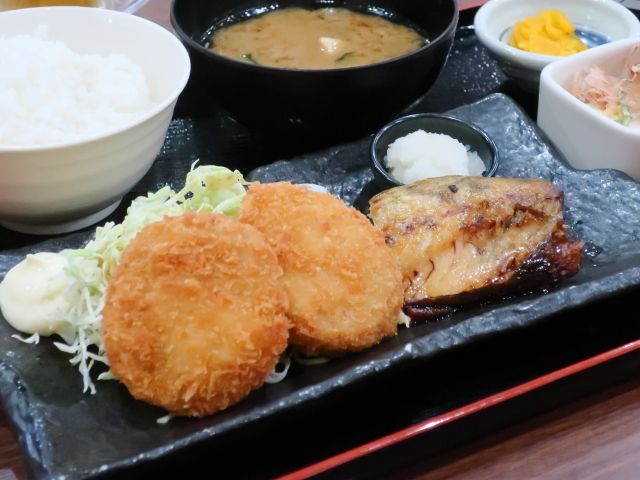 鮭フライは好きだが、ミンチは馴染みがないな、ということで『焼き鯖と鮭メンチ定食』。