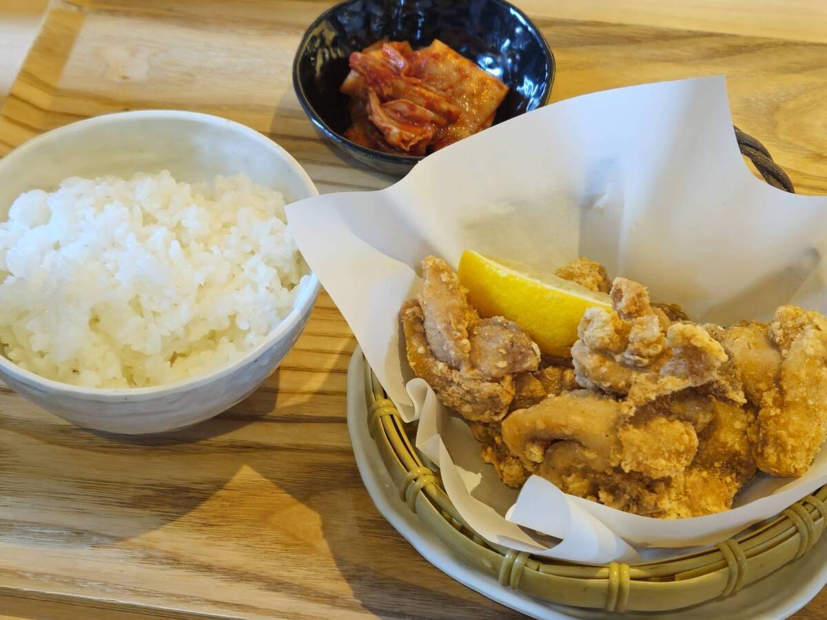 ボリューム満点の唐揚げに白米、キムチ、お味噌汁がセットになっています。