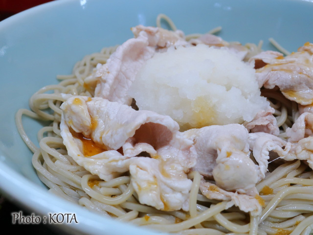 なので、豚やおろしにかからないように、そばにだけつゆをかける。