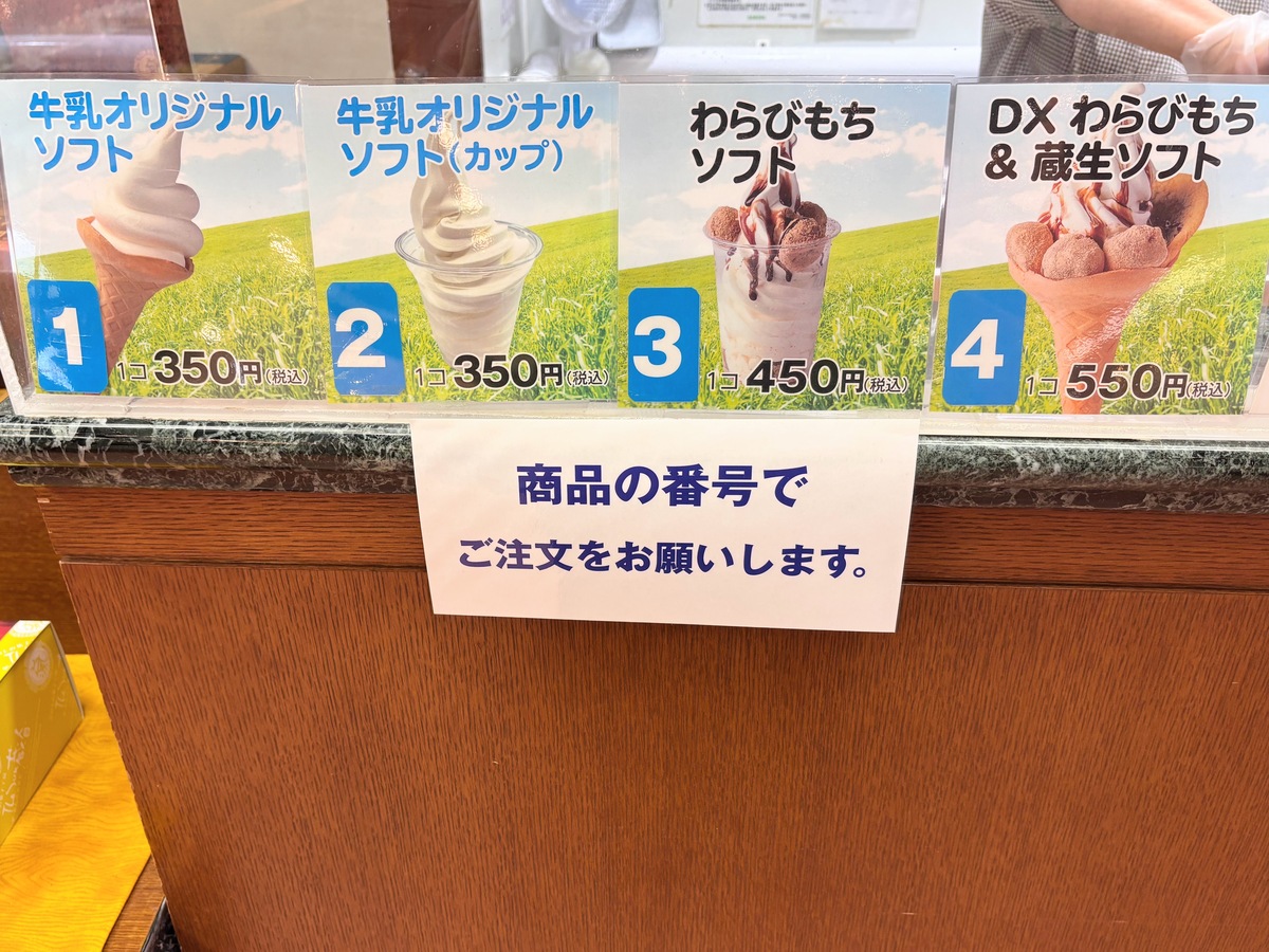 3の「わらびもちソフト」をお目当てに行ったはずだったのですが、4の「DXわらびもち&蔵生ソフト」に心惹かれてしまいました。