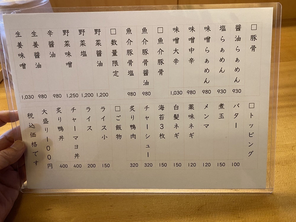 メニューには、豚骨の醤油・塩・味噌・味噌中辛・味噌大辛。他に魚介豚骨の醤油と塩がありました。