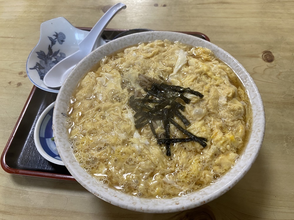 出てきた丼はけっこうな大きさ。その大きな丼の表面が見えなくなるぐらいにたっぷりの玉子が浮かんでいます。