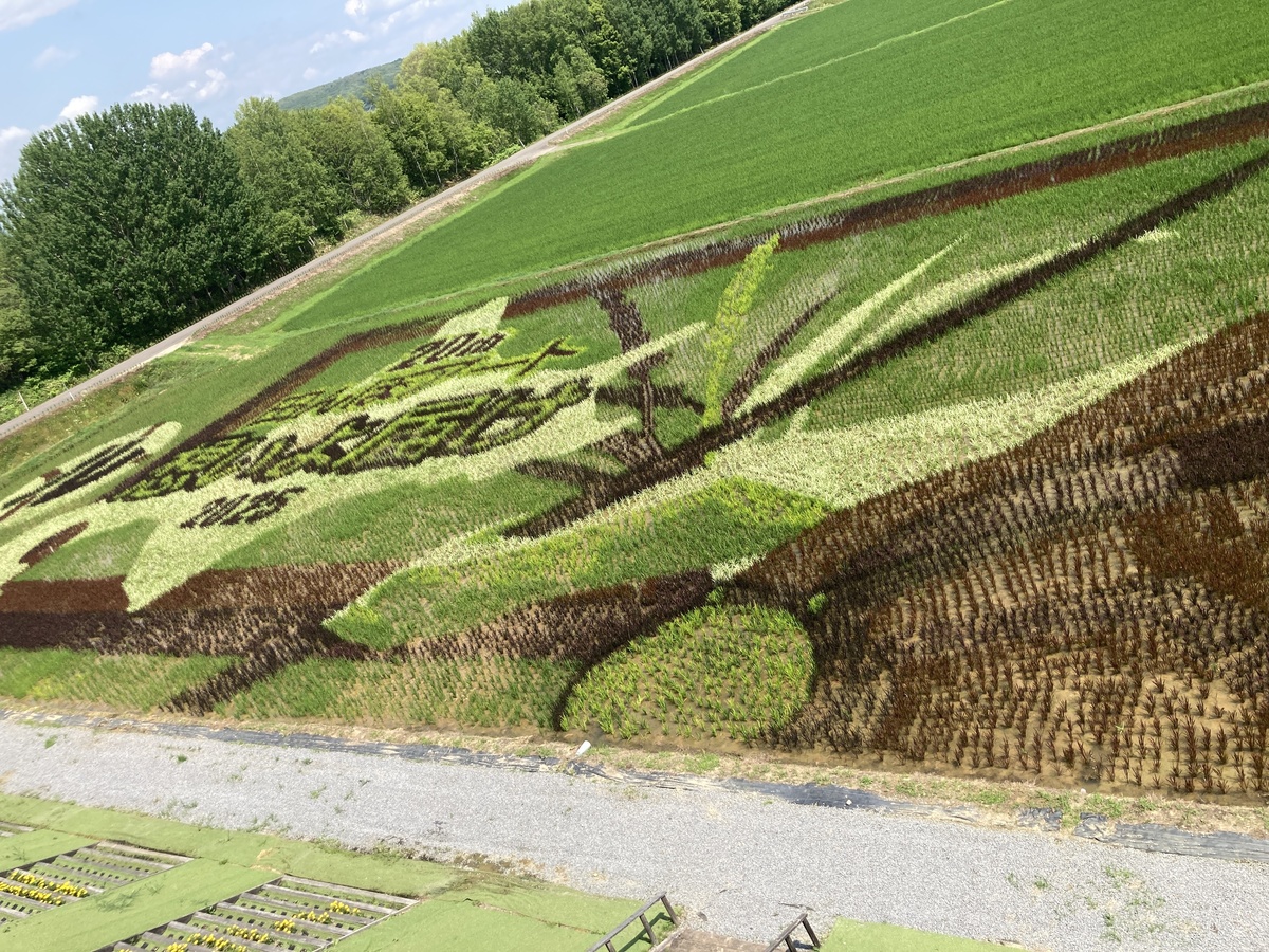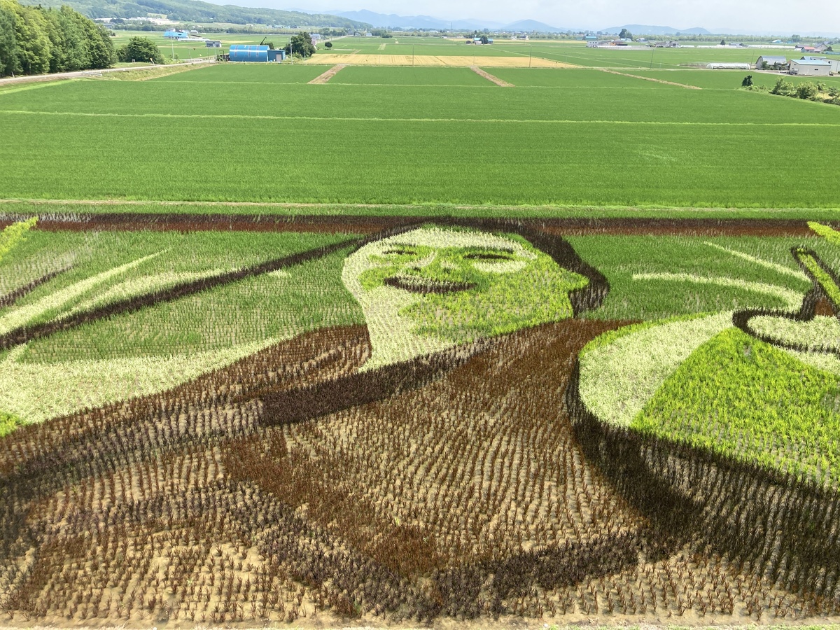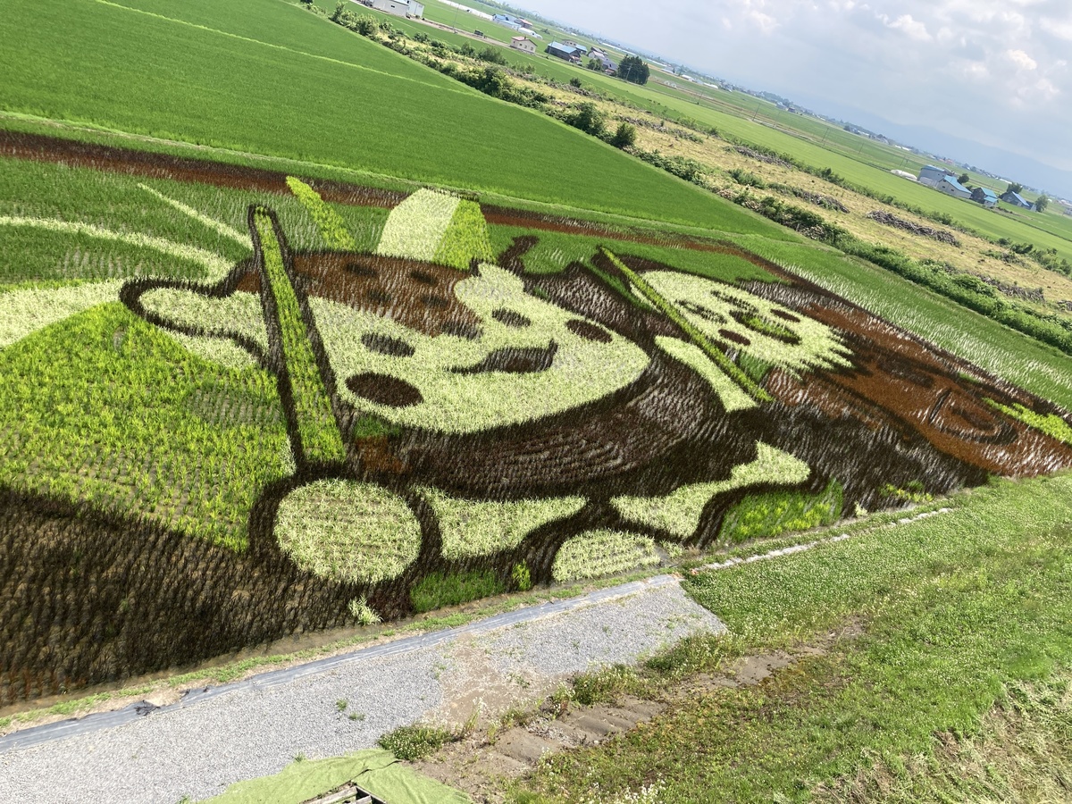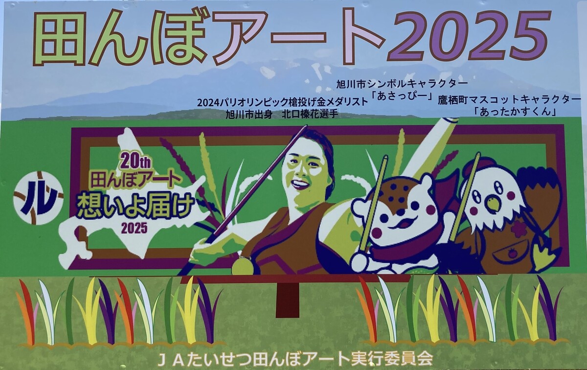 今年の田んぼアートには、やりを構える北口選手とその隣には、2020年から毎年登場している旭川市のシンボルキャラクター「あさっぴー」と、鷹栖町のマスコットキャラクター「あったかすくん」も登場。