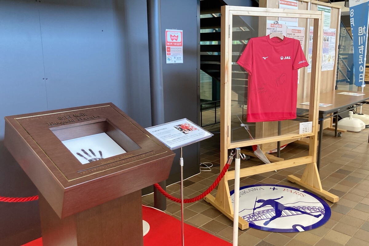 旭川市役所総合庁舎「北口榛花選手の手形&サイン入りユニフォーム」