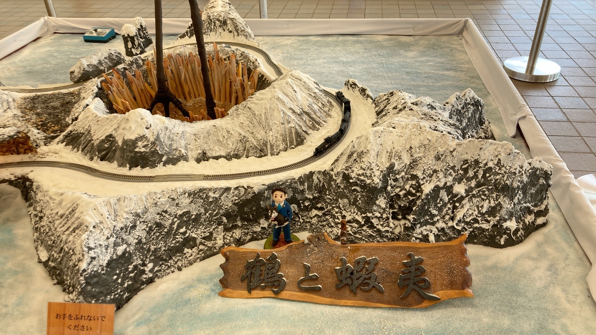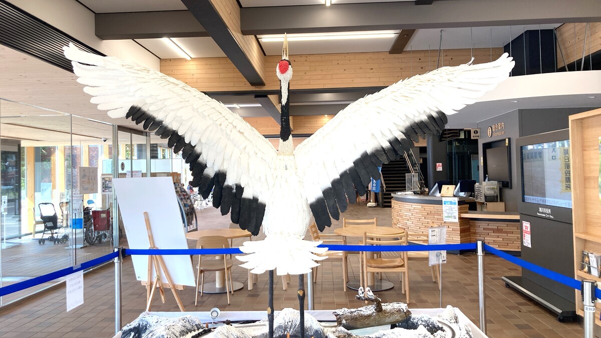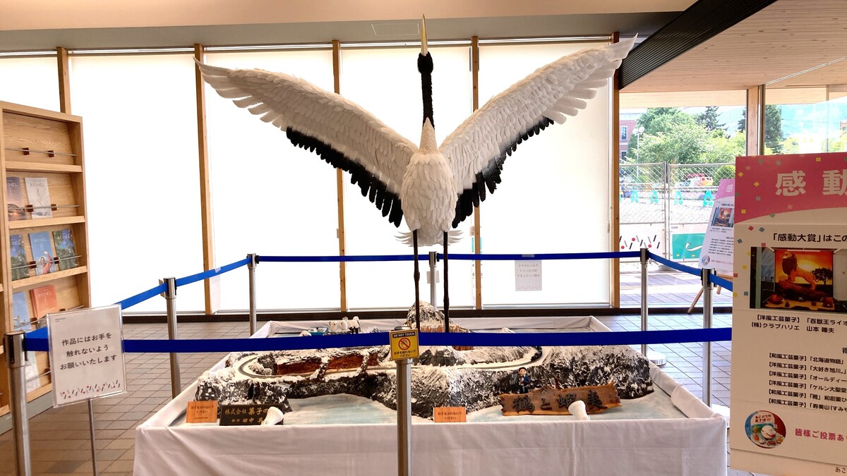 さらに同ロビーには、2025年5~6月に開催された「あさひかわ菓子博」で感動大賞2位を受賞した大型工芸菓子「鶴と蝦夷」も展示中。札幌の「菓子の樹」田中英雄さんによる作品で、北海道の大地を象った台座に大きな鶴が翼を広げる迫力の一品。お菓子でできているとは思えない精巧さです!