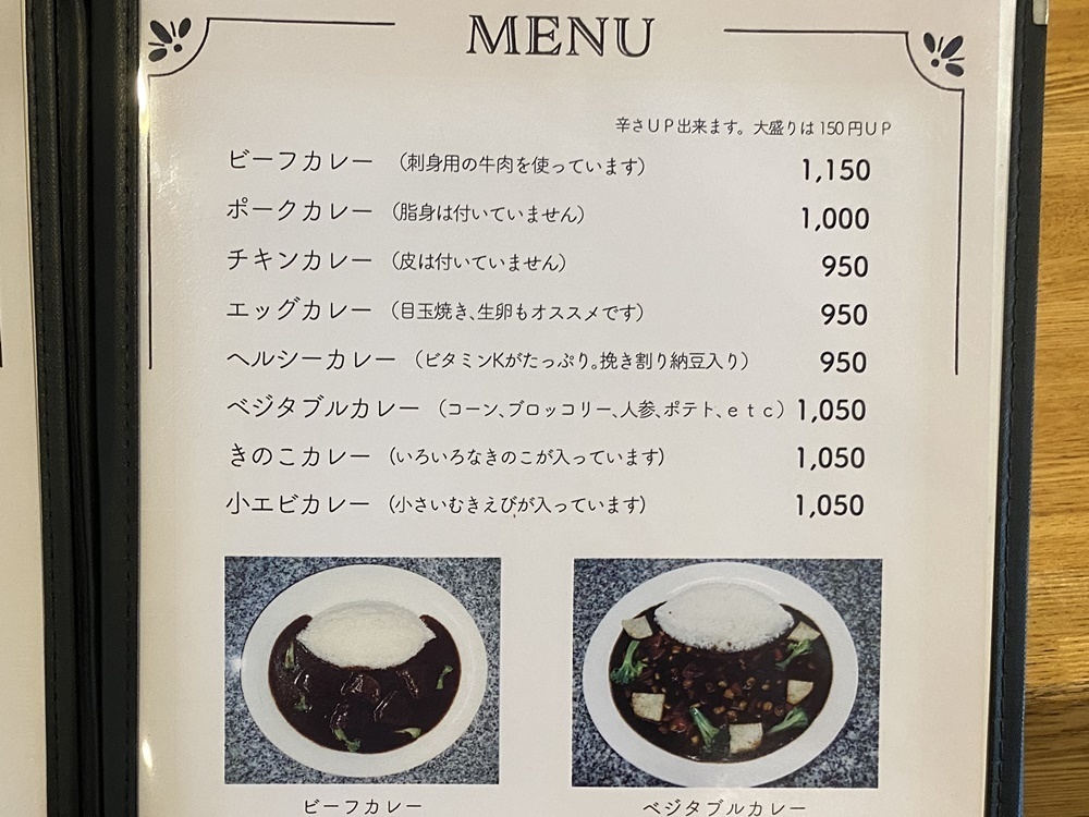 メニューには、スパイスカレーの他にもスープカレーやスパゲッティ、ピラフ、ピザなどがありましたが、せっかくなのでカレーを頂きましょう。