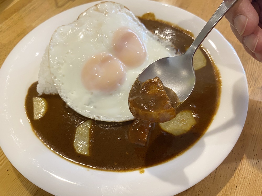 カレーの種類がかなり豊富で迷いましたが、「チキンカレー」に「目玉焼き」のトッピングを加えて注文しました。辛さは好みでUPできるようですが、普通の辛さです。