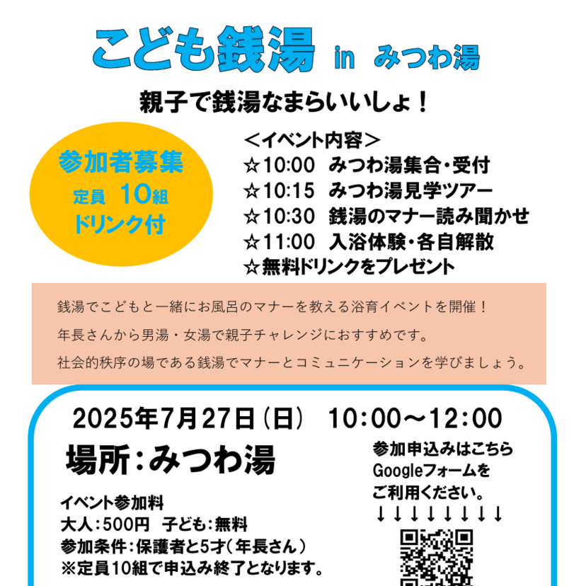 【7月27日】お風呂マナーを学べるこども銭湯inみつわ湯開催
