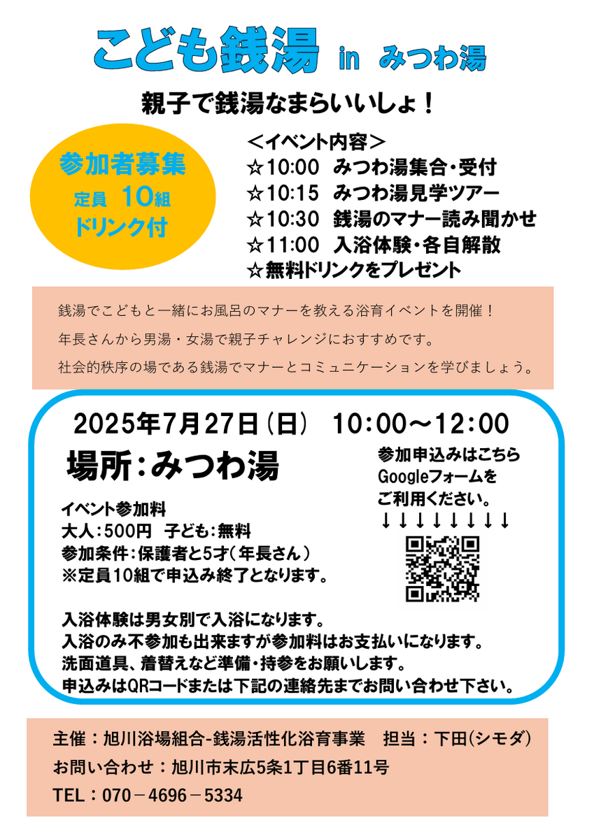 2025年7月27日(日)に旭川市のみつわ湯で『こども銭湯inみつわ湯』が開催されます。