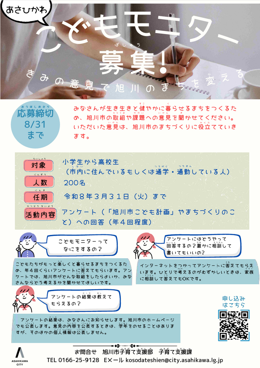 旭川市では小学生から高校生までのこどもモニターを募集しています。