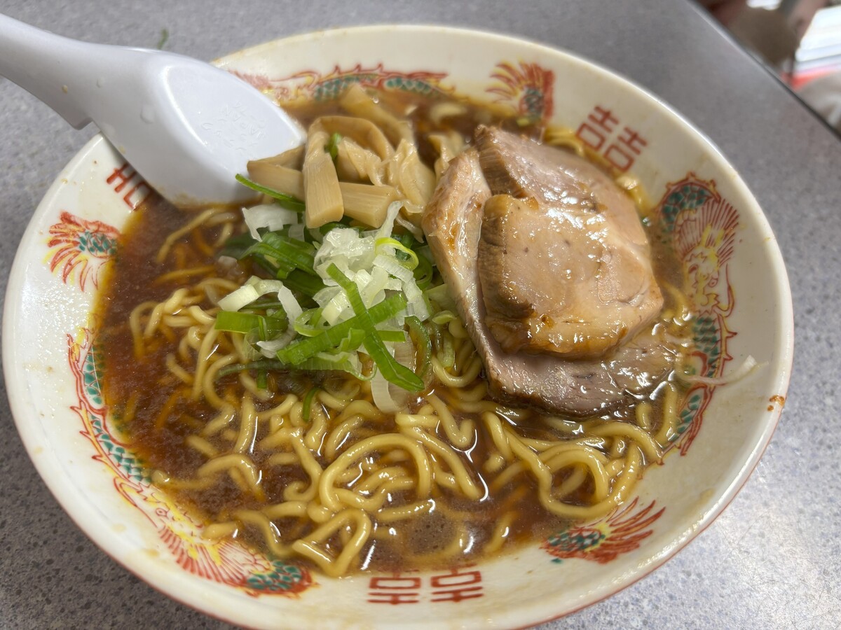 鶏ガラや煮干しなどの味がしっかりとしている濃い目のスープで、麺も同じく中細のちぢれ麺。