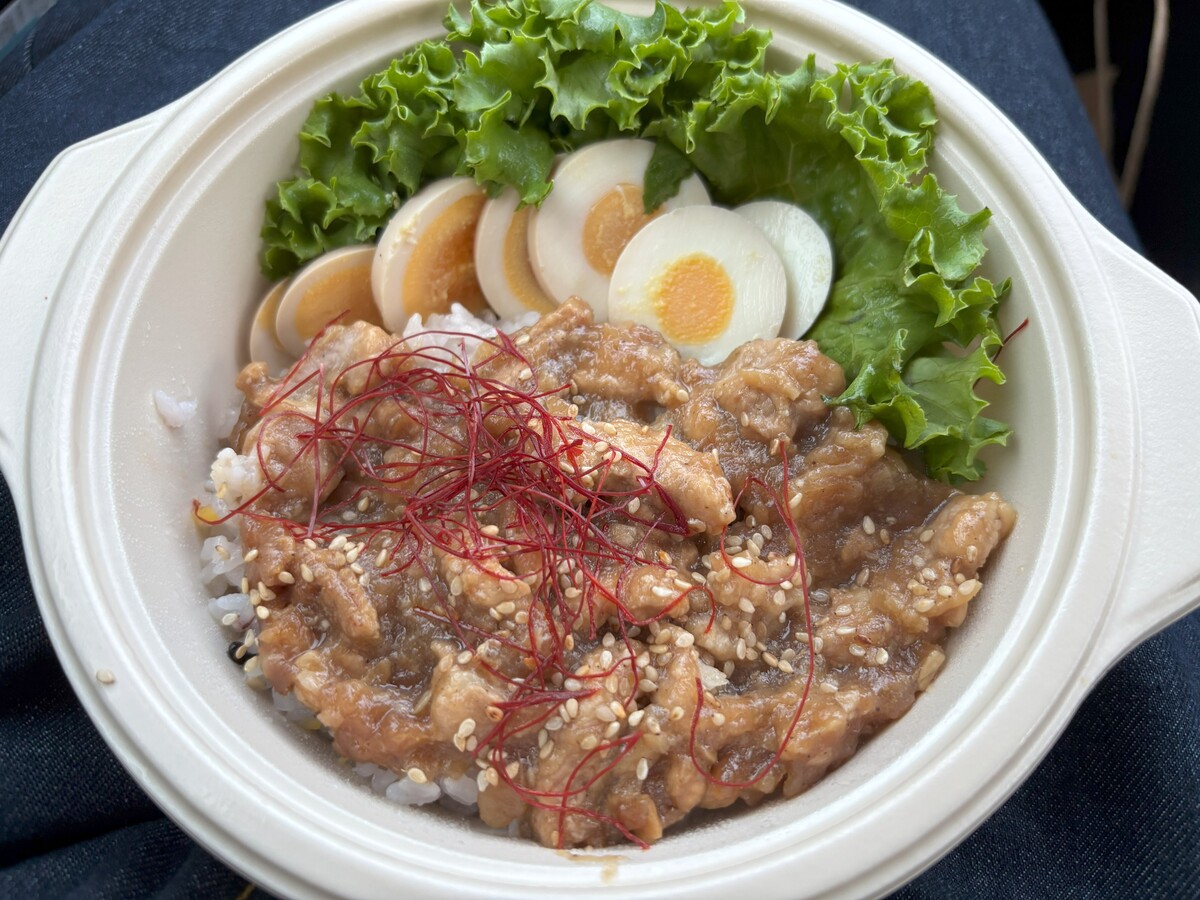 下のご飯は雑穀米で、ゆでたまごもお肉と一緒に食べるとうま味が増しご飯もすすみますよ。