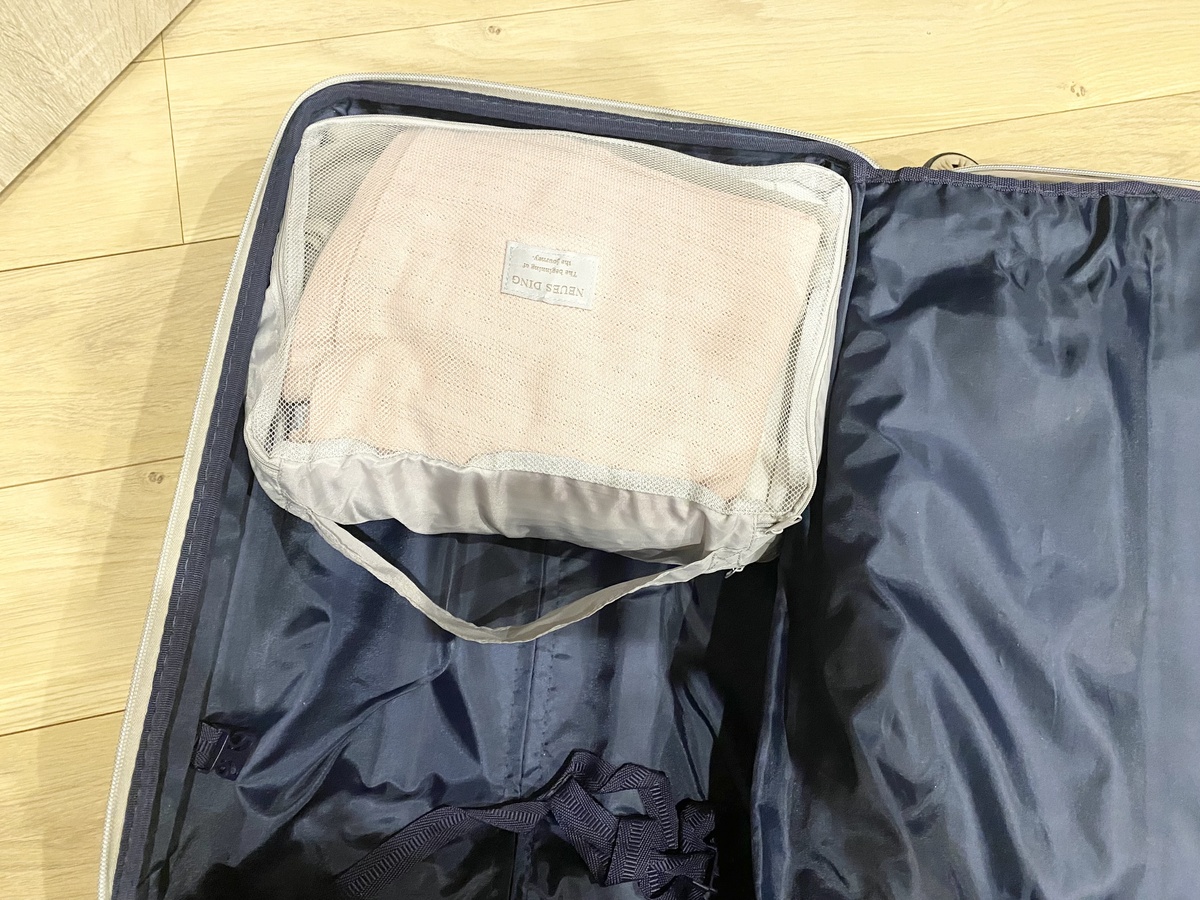 画像はSサイズで、機内持ち込み可能なスーツケースの片側半分に、綺麗に収まる大きさです。