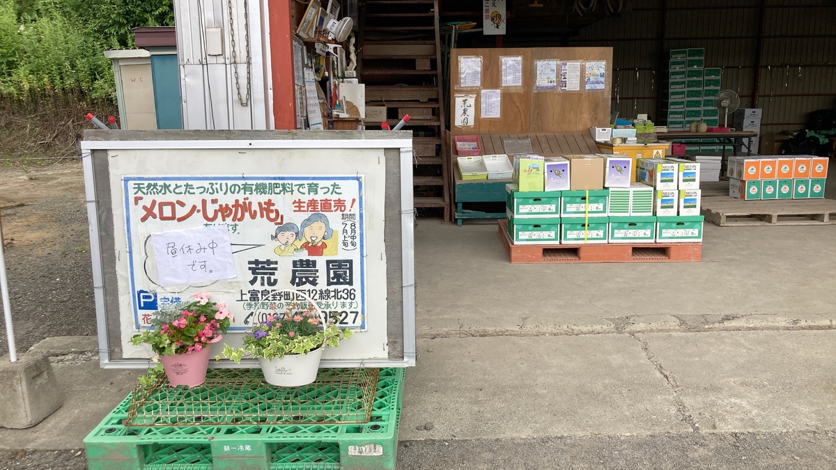 美瑛からさらに国道237号線を南下し、上富良野町へ。国道沿いにあるメロン農家「荒農園」では、夏の定番・赤肉メロンを直売しています。お向かいには「かんのファーム」があります。看板がしっかり出ているので、車でも見逃さず立ち寄れます。