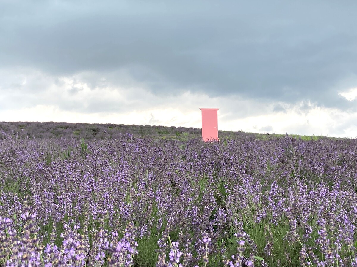 ラベンダー畑に突如現れるピンクの“どこでもドア”。紫とのコントラストが可愛く、記念写真にぴったりです。