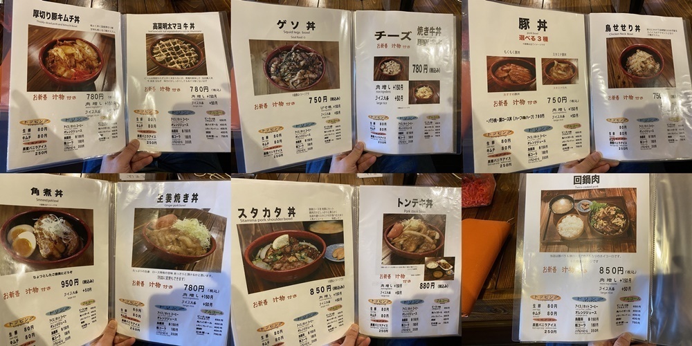 メニューには、焼き牛丼や豚丼、鳥せせり丼、トンテキ丼、スタカタ丼、高菜明太マヨ牛丼、ゲソ丼など、いろいろな丼物があります。