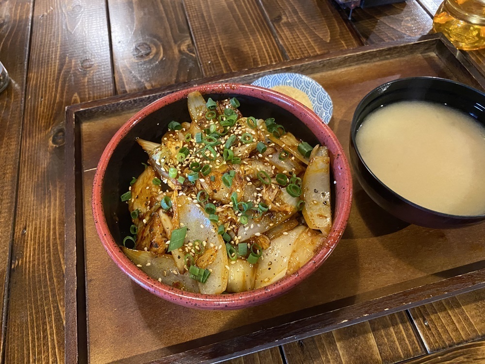 豚肉と玉ねぎ、ピリ辛のキムチが甘辛いタレで味付けされていて、ごはんにピッタリの味付け。