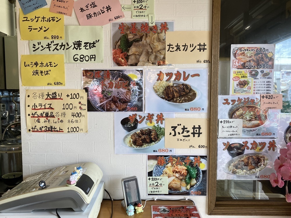 春光の「金次郎食堂」は、定食を含めメニューの種類がかなり豊富ですが、「金次郎食堂 東鷹栖店」のメニューは丼物を中心に、ユッケジャンラーメン、やきそば、カレー、ザンギなどです。