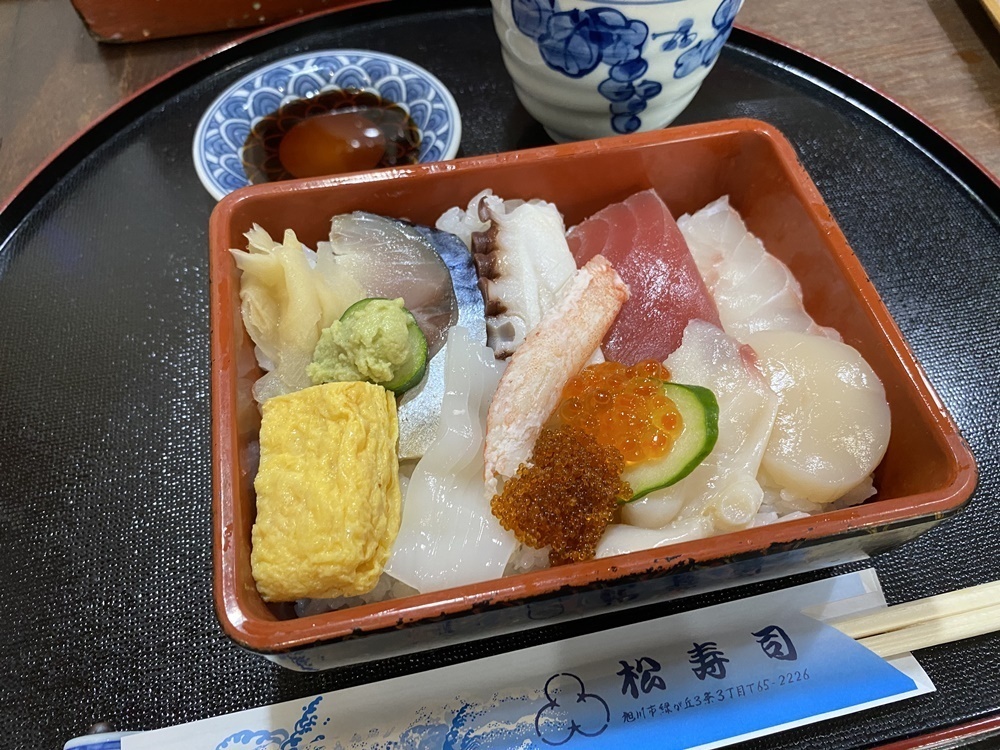 一般的に生ちらしは酢飯で、海鮮丼はふつうのごはんのことが多いですが、「松寿司 緑ヶ丘店」の「海鮮丼」は、酢飯の上にネタが並べられていました。