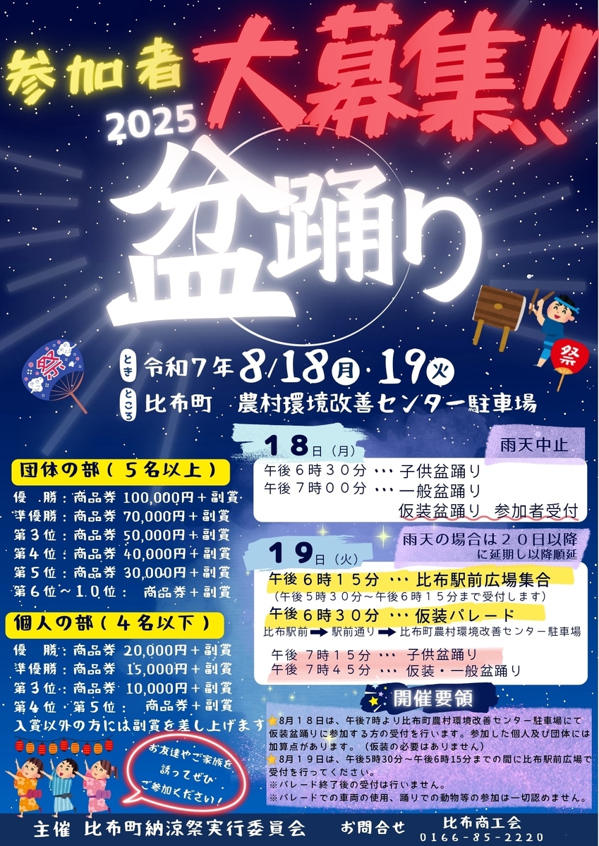 8月18日(月)と19日(火)の2日間、比布町農村環境改善センター駐車場をメイン会場に、子供盆踊り、一般盆踊り、仮装パレード・仮装盆踊りが行われます。