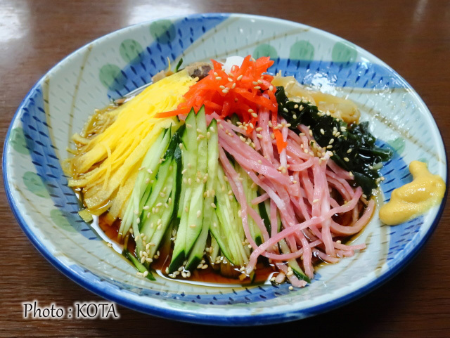 頂きに紅生姜を輝かせ、お馴染みのクラゲ、ワカメ、ハム、きゅうり、錦糸・・・