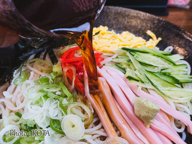 ハムやきゅうりなどスタイルはよくある冷やし中華だが、大きな特徴は「ねぎ」。ここらへんはいかにもそば屋らしい。