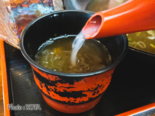 これまたどんな味なのか。猪口に、残ったタレを取り、そば湯を注いで味わってみれば、これまたびっくり。