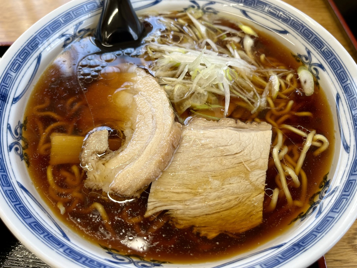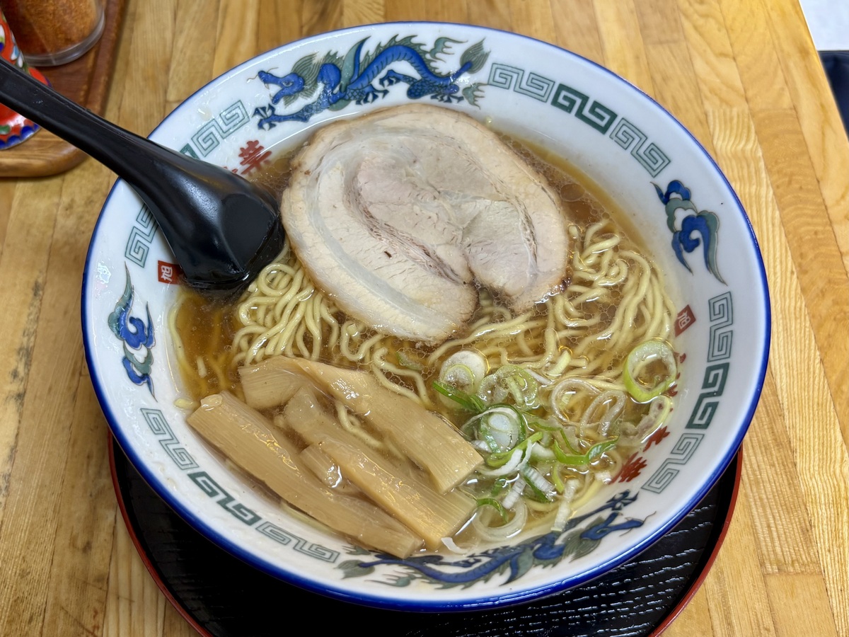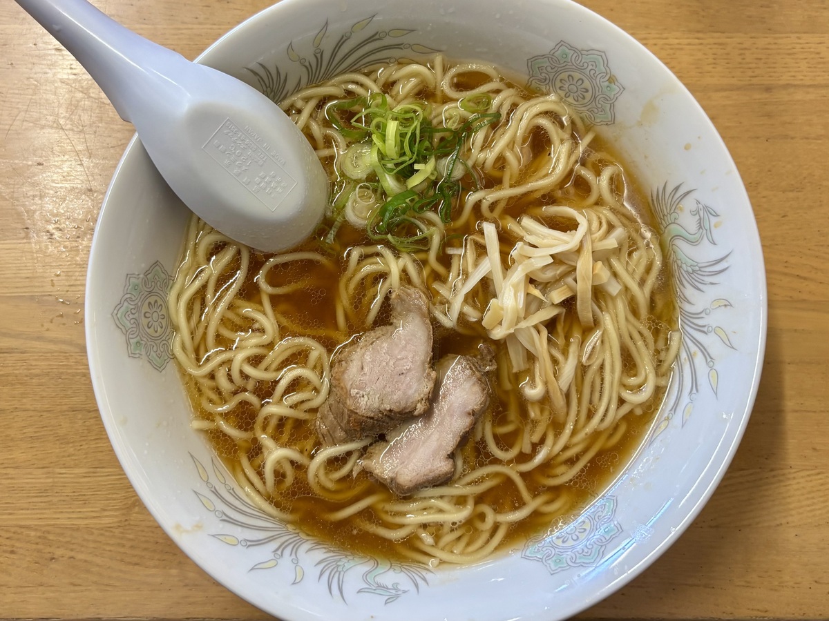 トッピングには、チャーシューとネギとメンマがのっており、全体的にとてもあっさりとした醤油ラーメンとなっております。