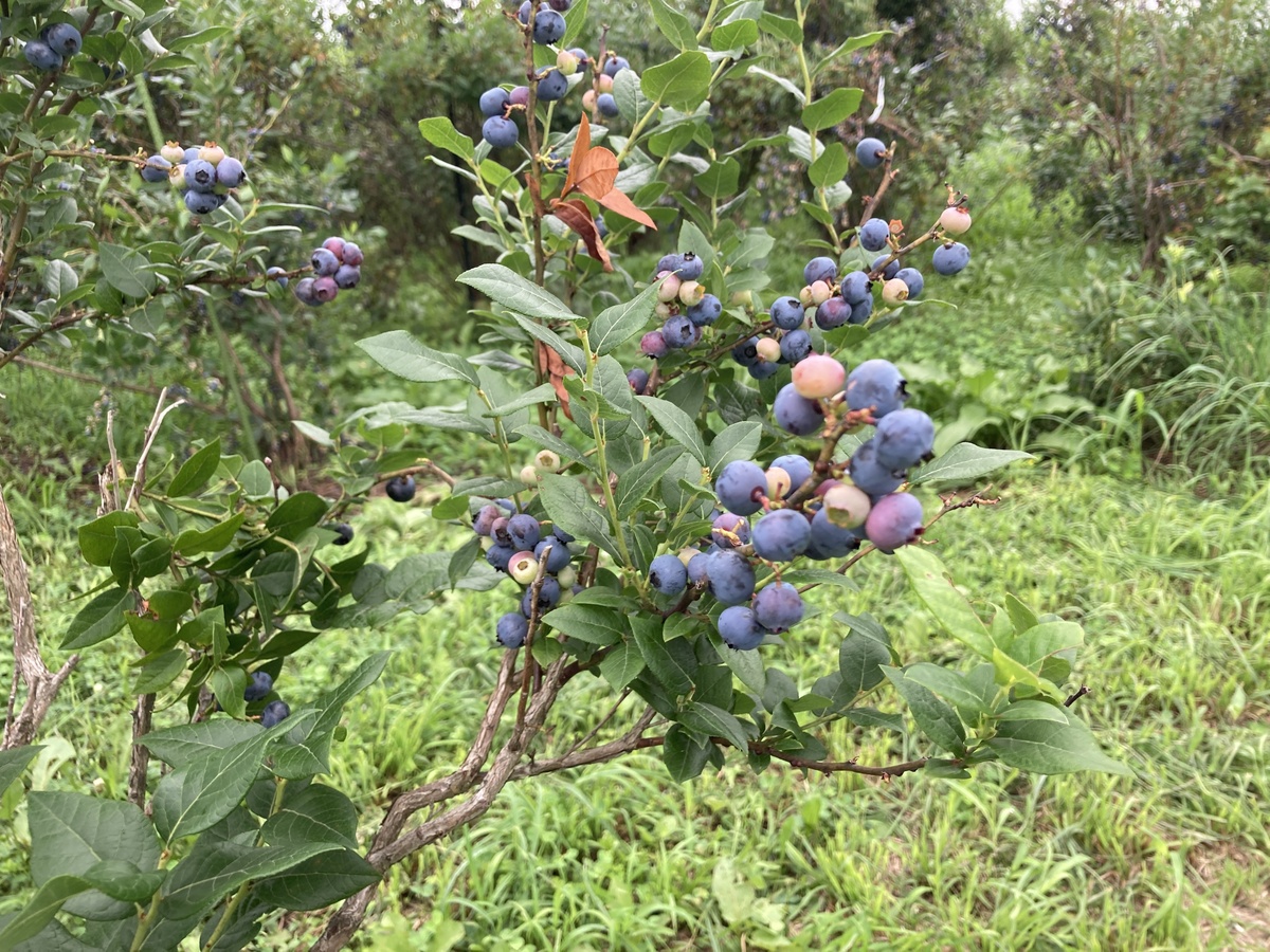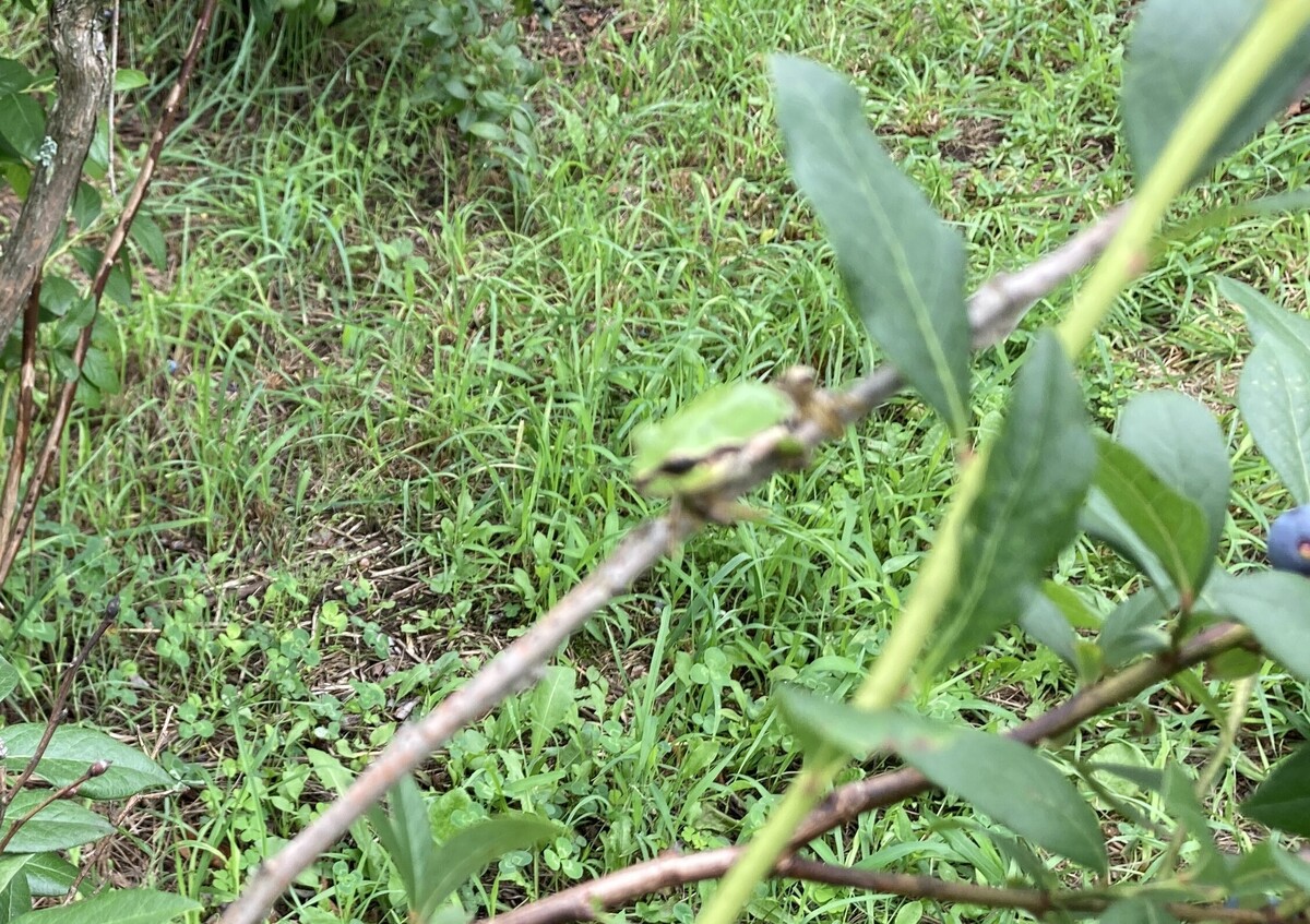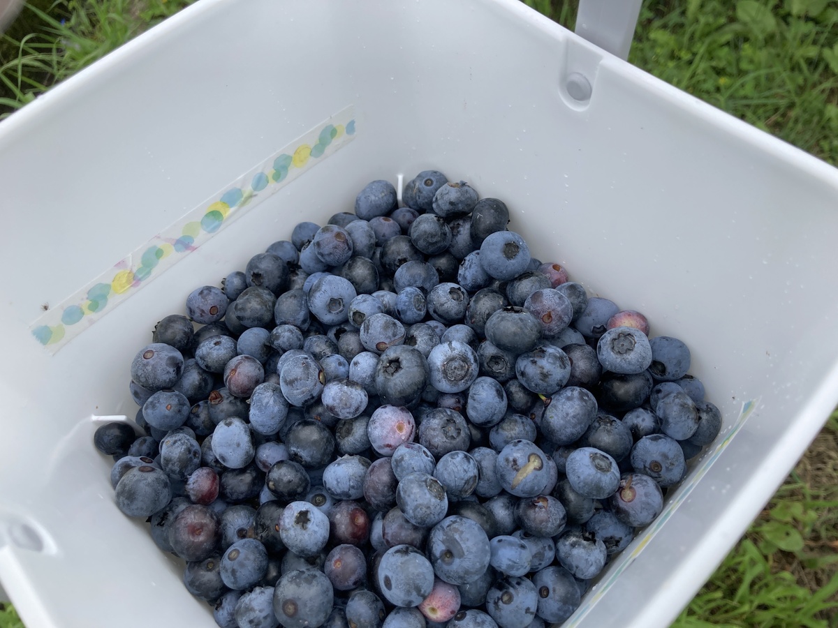 説明を受け、バケツを受け取ったら、道路を渡って斜め向かいのブルーベリー畑へ。草刈りは整備されていますが、雨の後は長靴がおすすめ。虫は少なめですが、虫よけスプレーがあると安心です。