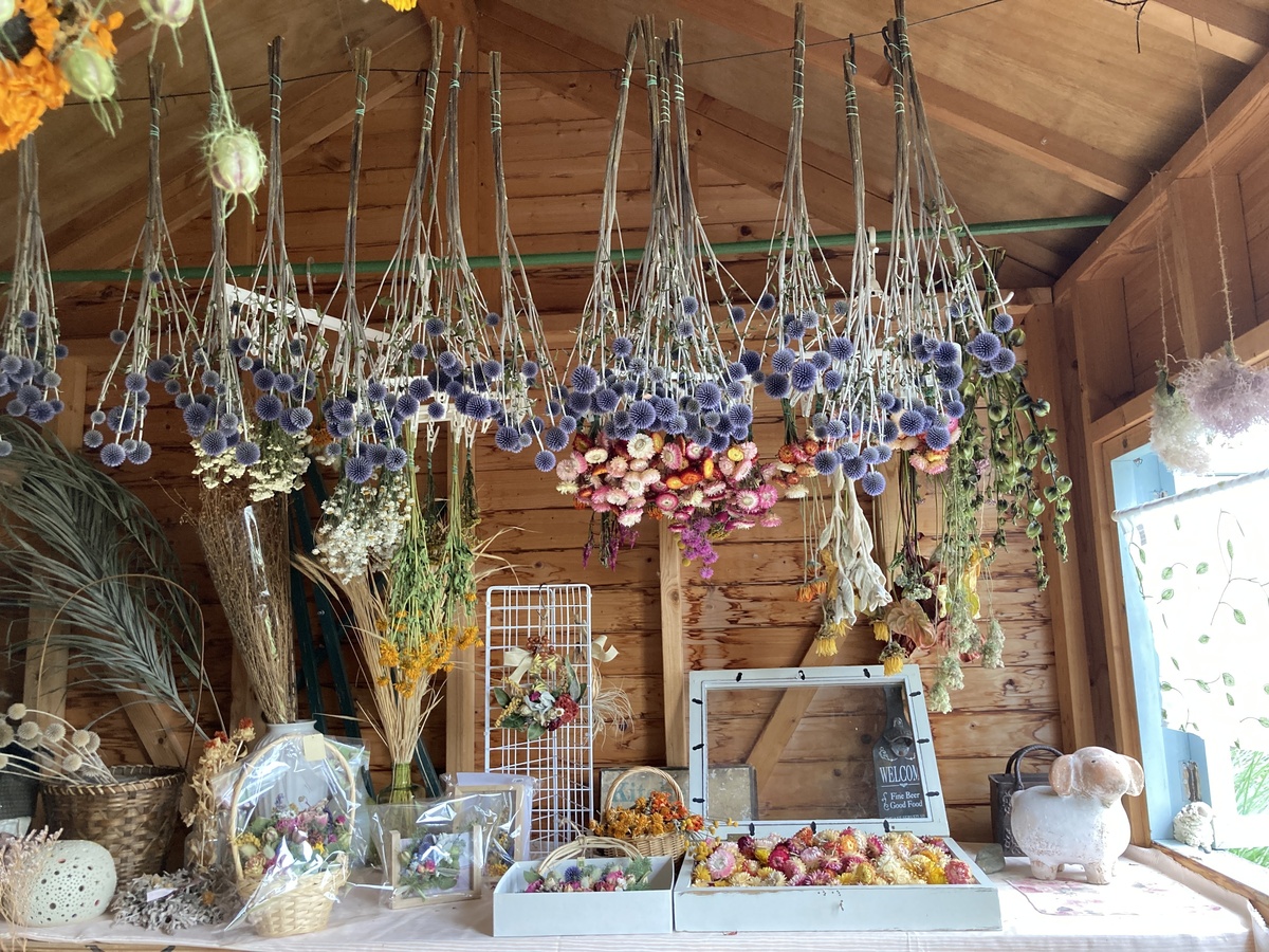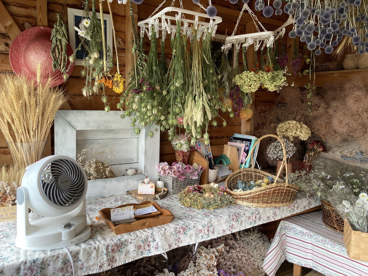 オーナーさん手作りのドライフラワーの直売所も併設されており、まるでヨーロッパの田舎のような雰囲気の中、センスの良いお花たちが並んでいます。価格もお手頃なので、ぜひ立ち寄ってみてください。