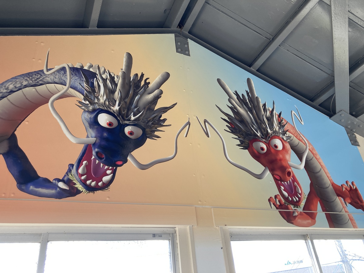 赤と青の大きな龍がこちらを見下ろすように描かれており、迫力満点。立体感のあるアートで、夜に見るとちょっと怖いかも?