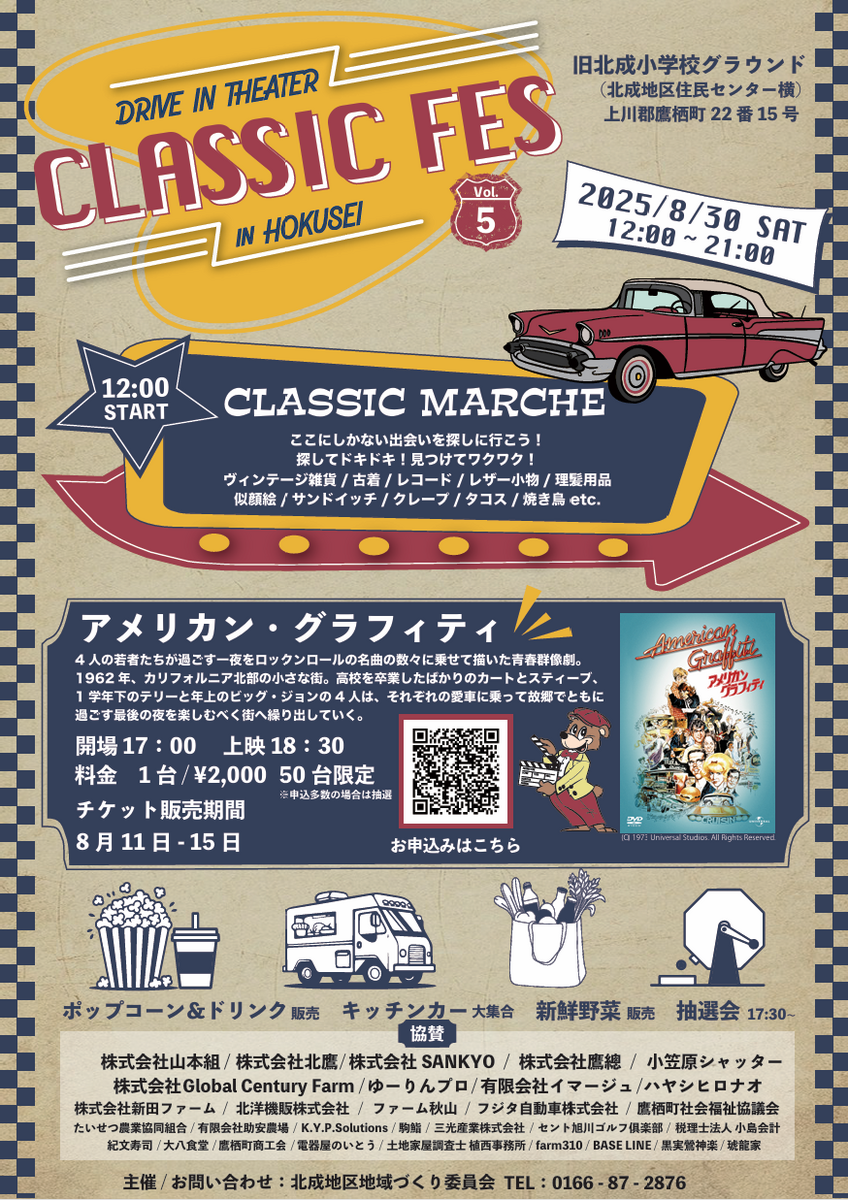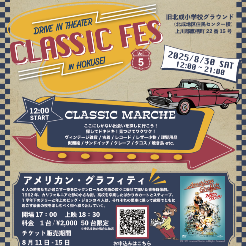 2025年8月30日(土)に鷹栖町の旧北成小学校で『DRIVE IN THEATER CLASSIC FES IN HOKUSEI』が開催されます。