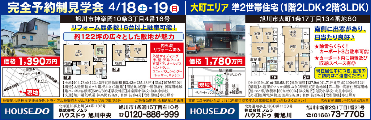ハウスドゥ旭川中央では4月18日(土)・19日(日)の2日間で神楽岡エリアにある物件の完全予約制見学会を開催します。