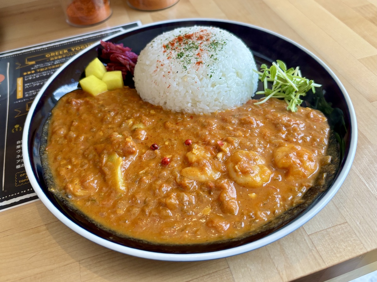 人気No1メニューの「エビとアサリの魚介カレー(税込¥1,210)」は、野菜の甘みと魚介の旨みが凝縮された、見た目も華やかな無水スパイスカレー。