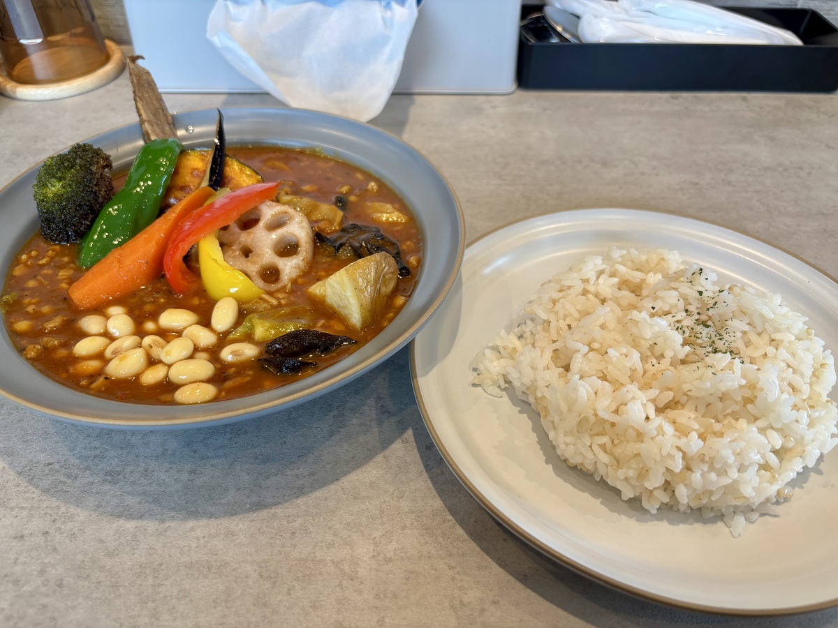 彩り豊かな野菜は小ぶりなカットが食べやすく、キーマカレーとスープカレーの融合ですが、違和感なく楽しむことができますよ♪