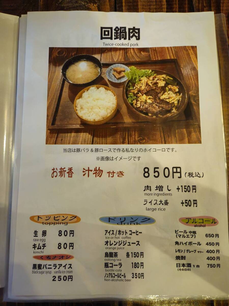 お肉やゲソ丼メニューなど豊富に揃っていますが、今回ご紹介するのは『回鍋肉(税込850円)』。