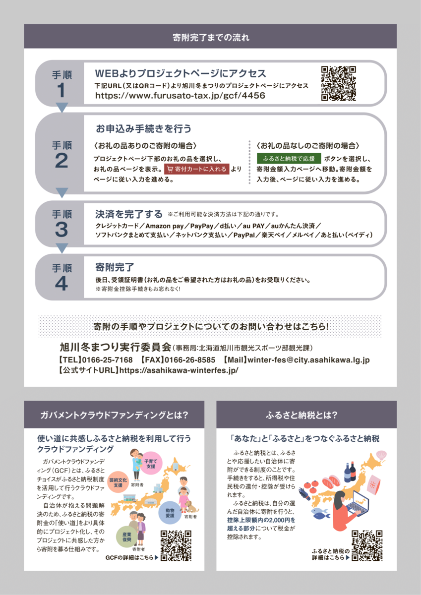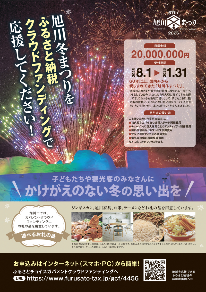 旭川冬まつり実行委員会では、各経費の全面的な見直しを検討しながらも、新たな財源の確保に努め、未来の子ども達や観光客のみなさまを含む全ての皆様に楽しんでいただく旭川冬まつりを開催するため、ふるさと納税型クラウドファンディングを募集することとなりました。