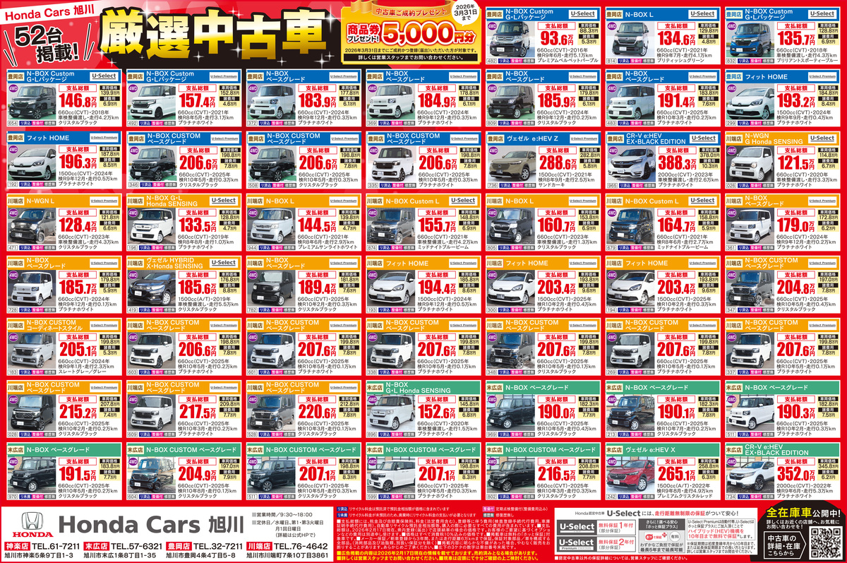 Honda Cars 旭川では2026年3月31日までに中古車をご成約で商品券5,000円分をプレゼント。