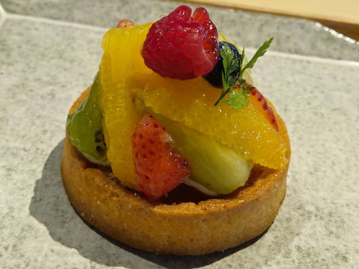オレンジやキウイ、イチゴ、ラズベリー、ブルーベリーなど色鮮やかなフルーツが盛り付けられています。