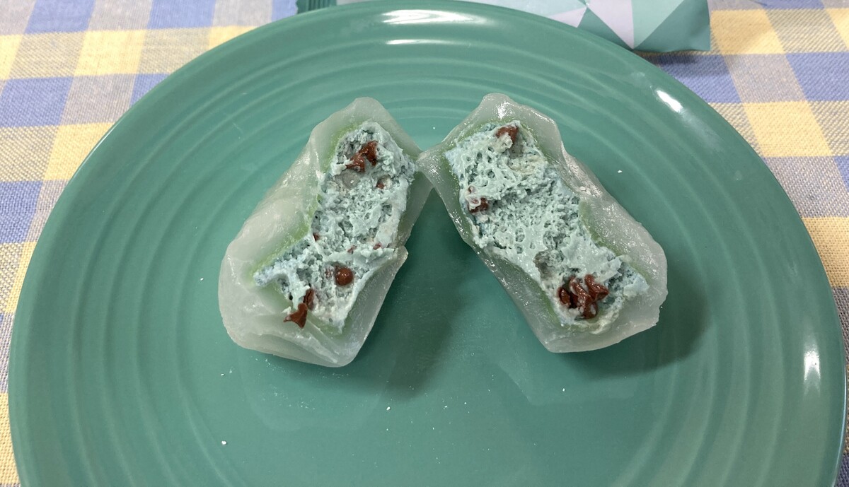 ぷるぷる&透明感のあるわらび餅の中に、ちゃんとスースーするミントクリームとチョコチップが入っています。