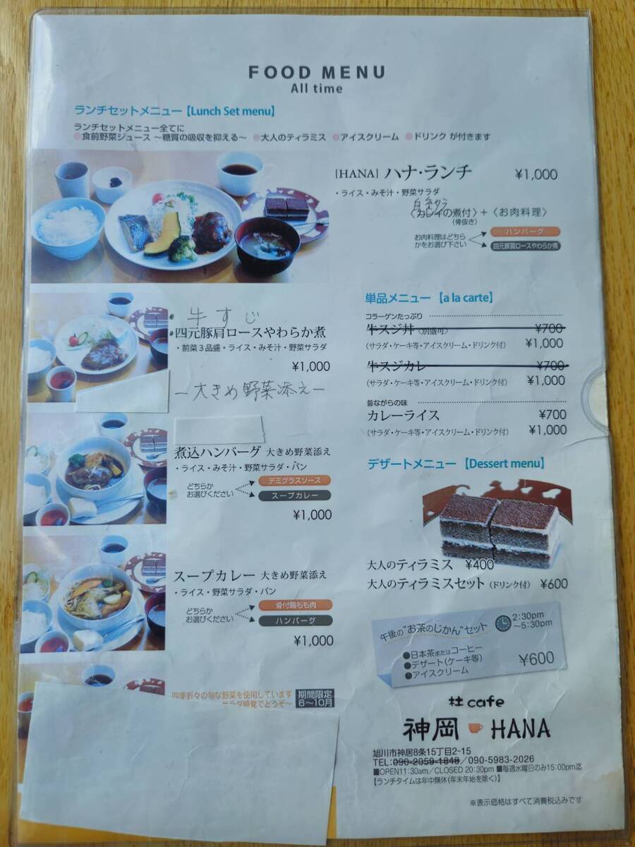 価格は全て税込1,000円で、お肉とお魚がセットのハナ・ランチや、ハンバーグ、牛すじ、スープカレーなどがあります。