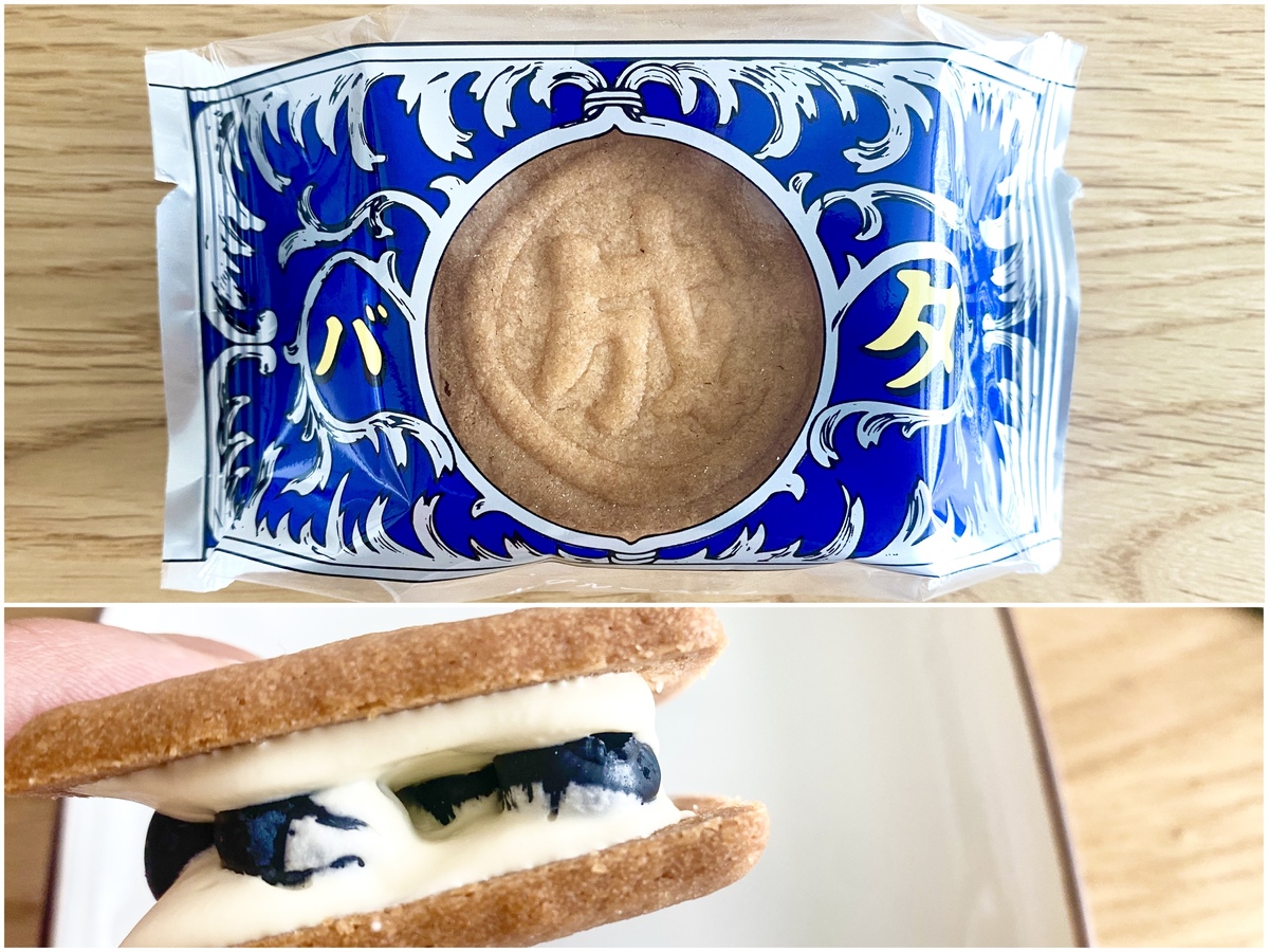 形は、バターサンドとは異なり正方形。生のブルーベリーと、ホワイトチョコ入りのバタークリームをビスケットでサンドしています。