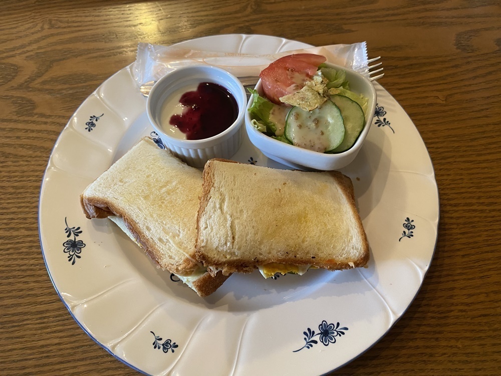 「Cafe 花みずき」でのホットサンドは、ベーコン・レタス・トマト・ゆで卵・チーズが挟まっていて、焼けたパンがサクとした食感でおいしいです。