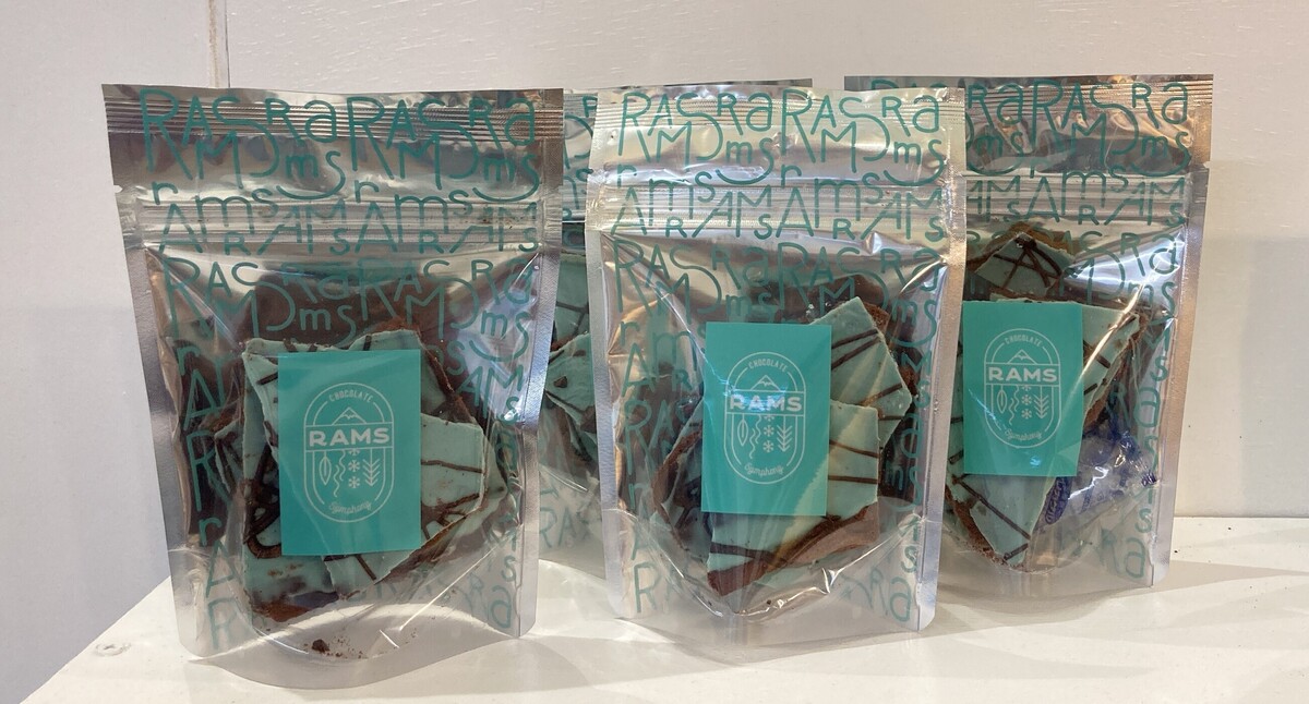 このパフェの最大のポイントは、上にのっている壺屋の「RAMS CHOCOLATE」シリーズから登場した「サクサク北海道チョコミント」。